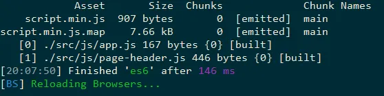 Nasza templatka podobnie jak w przypadku scss połączy takie pliki w jeden plik wynikowy, czyli dist/js/script.min.js (jeżeli nie odpowiada ci się ta nazwa, możesz sobie ją zmienić w pliku webpack.config.js - ale wcześniej przerwij działanie gulpa kombinacją Ctrl + C w terminalu).